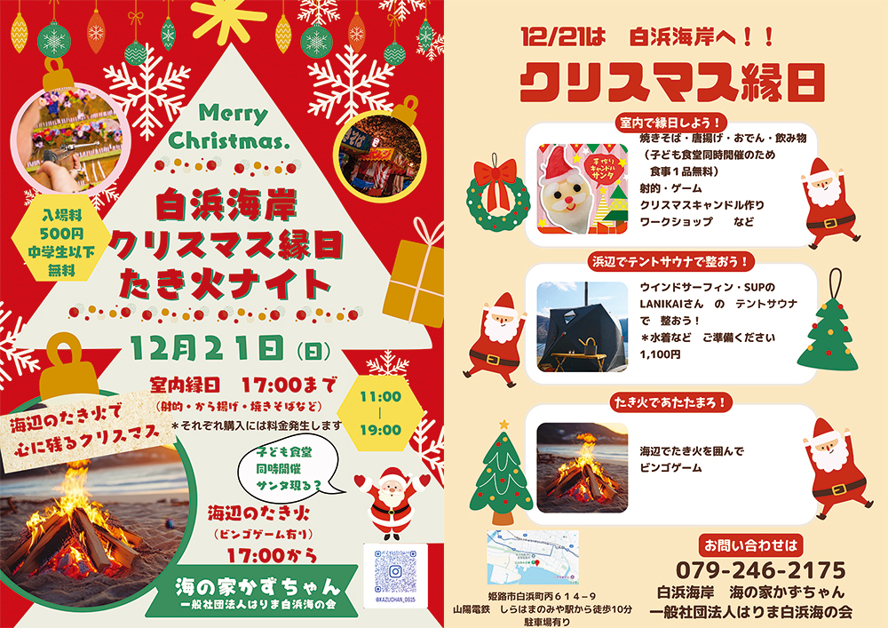 12月21日にクリスマスイベントが開催されます。室内縁日などイベントが盛りだくさん!海辺のたき火で心に残るクリスマスを過ごしませんか?